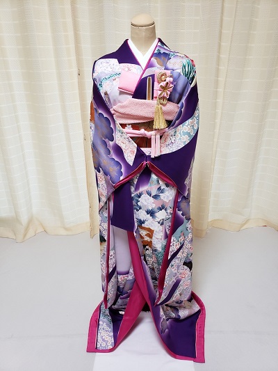 濃い紫地に薄紫の花々が可憐なお振袖です。